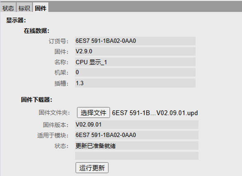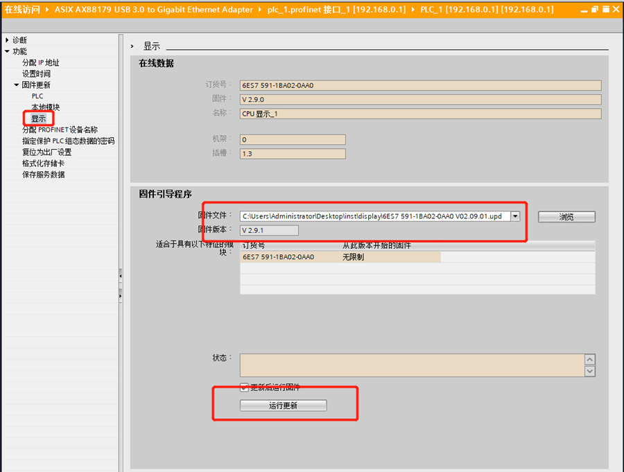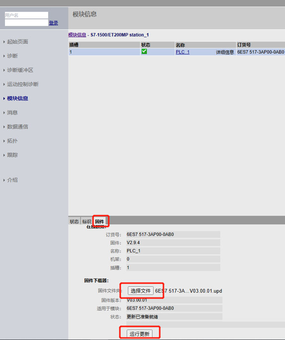 1. 先將CPU轉至在線,在線和診斷中點擊“功能”-“固件更新”,在PLC下選擇固件文件,運行更新